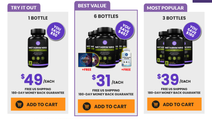 Metabrim NRG is priced at $49 per bottle, although the price drops as low as $34 per bottle when ordering multiple units.